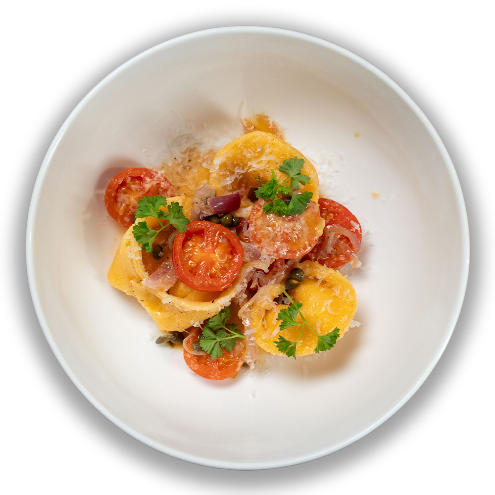 Topfen-Ravioli: Handgemachte Pasta mit cremiger Topfenfüllung, geschwenkt in einer aromatischen Butter-Tomaten-Sauce. Fein, ausgewogen und voller Geschmack. Ein bisschen Aufwand – aber genau das macht den Teller besonders.